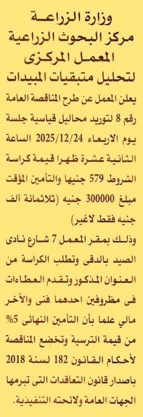 HOT Information مناقصة عامة رقم 8 لعملية توريد محاليل قياسية عن جريدة الأهرام Post navigation شركة السكر والصناعات التكاملية المصرية الجمعية التعاونية لبناء المساكن للعاملين بالأكاديمية العربية للنقل البحري