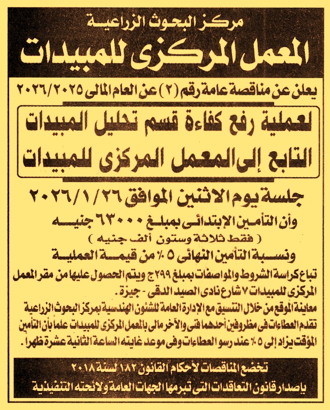 HOT Information مناقصة عامة رقم 2/2025/2026 لعملية رفع كفاءة قسم تحليل المبيدات عن جريدة الجمهورية Post navigation الغرفة التجارية المصرية بدمياط الإدارة العامة لصرف غرب الفيوم