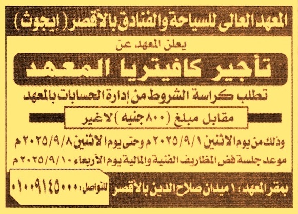 HOT Information مزايدة علنية لعملية تأجير كافتيريا المعهد للعام الدراسي 2025/2026 (تباع الكراسة في الفترة من يوم 1/9/2025 حتى يوم 8/9/2025) عن جريدة الجمهورية Post navigation الجمعية التعاونية للبناء والإسكان للعاملين بشركة المشروعات البترولية والاستشارات الفنية مركز شباب ناطورة بكفر صقر
