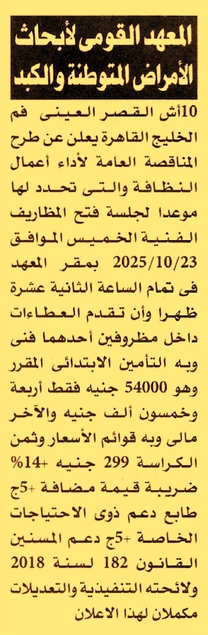 HOT information مناقصة عامة لعملية تنفيذ أعمال النظافة عن جريدة الأهرام Post navigation الشركة المصرية لإدارة وتشغيل المترو هيئة إنقاذ الطفولة – مكتب مصر