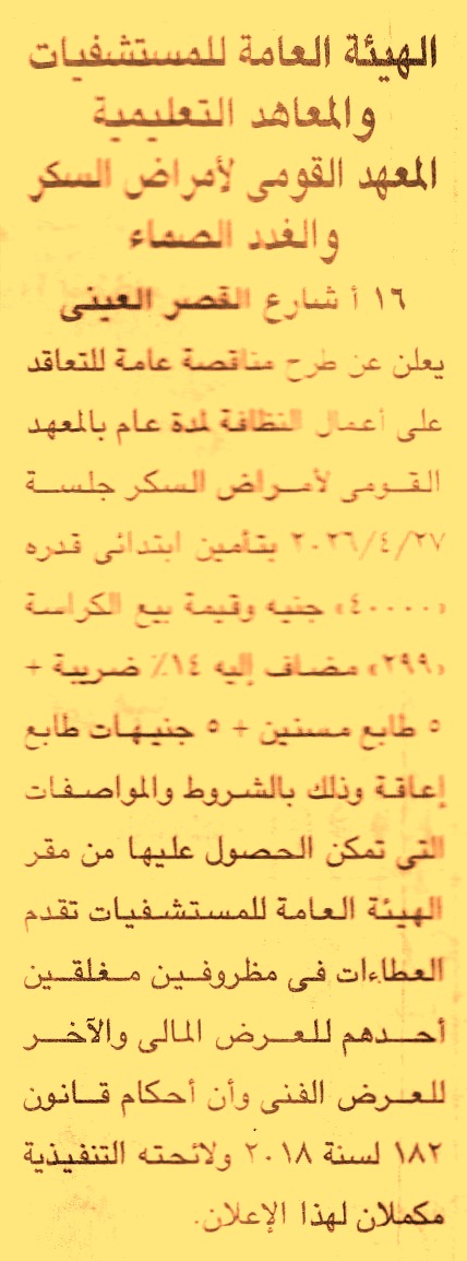 HOT Information مناقصة عامة لعملية تنفيذ أعمال النظافة لمدة عام بالمعهد عن جريدة الجمهورية Post navigation الجمعية التعاونية للبناء والإسكان للعاملين وأعضاء نادي شركة الأعمال الهندسية ببورسعيد محافظة كفر الشيخ