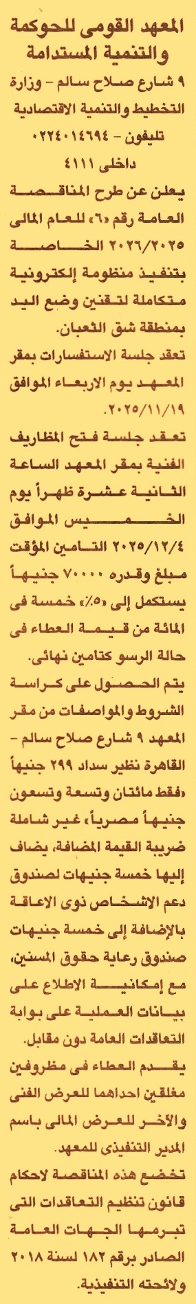 HOT Information مناقصة عامة رقم 6/2025/2026 لعملية تنفيذ منظومة إلكترونية متكاملة لتقنين وضع اليد بمنطقة شق الثعبان (جلسة الاستفسارات يوم 19/11/2025) عن جريدة الجمهورية Post navigation نادي الزهور الرياضي الوحدة المحلية لمدينة سفاجا