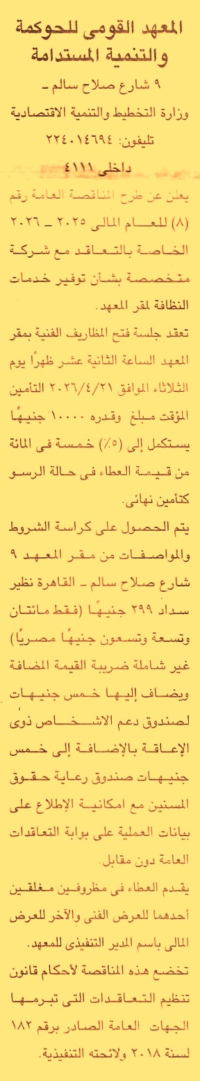 HOT Information مناقصة عامة رقم 8/2025/2026 لعملية تقديم خدمات النظافة لمقر المعهد عن جريدة الجمهورية Post navigation مركز شباب جناج الوحدة المحلية لمركز ادكو