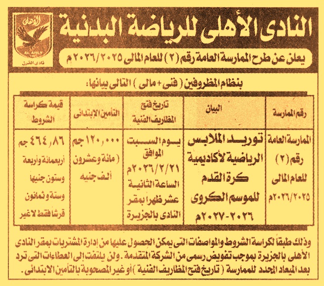 HOT Information ممارسة عامة رقم 2/2025/2026 لعملية توريد الملابس الرياضية لأكاديمية كرة القدم للموسم الكروي 2026/2027 عن جريدة الجمهورية Post navigation نادي النصر الرياضي