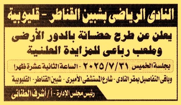 HOT Information مزايدة علنية لعملية تأجير حضانة بالدور الأرضي وملعب رباعي عن جريدة الجمهورية Post navigation نادي رويال الرياضي جامعة المنصورة
