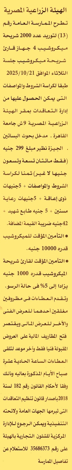 HOT Information ممارسة عامة رقم 13/2025/2026 لعملية توريد الأتي (1) عدد 2000 شريحة ميكروشيب (2) 4 جهاز قارئ شريحة ميكروشيب عن جريدة الأهرام Post navigation شركة إم أو تي للاستثمار والتنمية مؤسسة مستشفى أورام الأطفال 57357