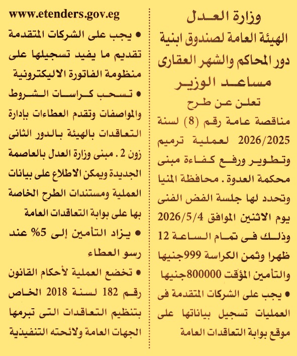 HOT Information مناقصة عامة رقم 8/2025/2026 لعملية ترميم وتطوير ورفع كفاءة مبنى محكمة العدوة بمحافظة المنيا عن جريدة الأهرام Post navigation جمعية عطاء بلا حدود لتنمية المجتمع بمحافظة أسيوط الشركة المصرية لإدارة وتشغيل المترو