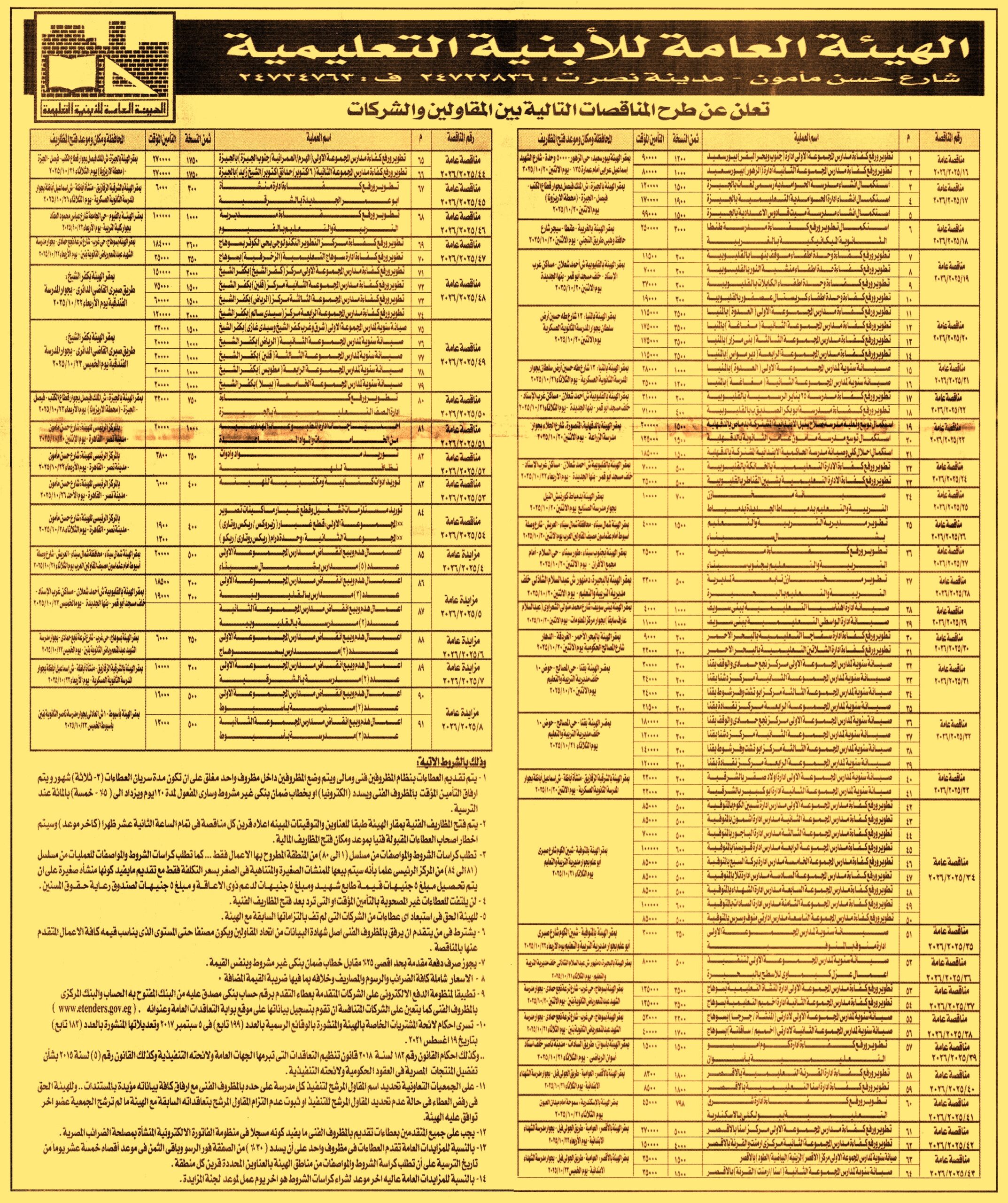 (مدة سريان العطاءات 3 شهور ويسدد التأمين إلكترونيا أو بخطاب ضمان ساري لمدة 4 أشهر وتباع الكراسة بسعر التكلفة للمنشأت الصغيرة والمتناهية الصغر وللهيئة الحق في استبعاد أي عطاءات من الشركات التي لم تف بالتزاماتها السابقة مع الهيئة ويرفق مع المستندات أصل شهادة البيانات من اتحاد المقاولين ويكون المقاول مصنفا حتى المستوى الذي يناسب قيمة كافة الأعمال المتقدم عنها بالمناقصة ويجوز صرف دفعة مقدمة بحد أقصى 25% مقابل خطاب ضمان بنكي غير مشروط وبنفس القيمة والأسعار شاملة كافة الضرائب والرسوم والمصاريف وخلافه بما فيها ضريبة القيمة المضافة وتطبيقا لمنظومة الدفع الإلكتروني على الشركة المتقدمة بعطاء التقدم برقم حساب بنكي مصدق عليه من البنك المفتوح به الحساب والبنك المركزي بالمظروف الفني كما يتعين على الشركات المتنافسة أن تقوم بتسجيل بياناتها على موقع بوابة التعاقدات العامة www.etenders.gov.eg