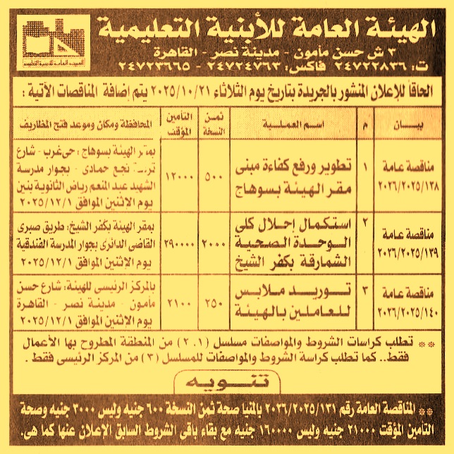 (مدة سريان العطاءات 3 شهور ويسدد التأمين إلكترونيا أو بخطاب ضمان ساري لمدة 4 أشهر وتباع الكراسة بسعر التكلفة للمنشأت الصغيرة والمتناهية الصغر وللهيئة الحق في استبعاد أي عطاءات من الشركات التي لم تف بالتزاماتها السابقة مع الهيئة ويرفق مع المستندات أصل شهادة البيانات من اتحاد المقاولين ويكون المقاول مصنفا حتى المستوى الذي يناسب قيمة كافة الأعمال المتقدم عنها بالمناقصة ويجوز صرف دفعة مقدمة بحد أقصى 25% مقابل خطاب ضمان بنكي غير مشروط وبنفس القيمة والأسعار شاملة كافة الضرائب والرسوم والمصاريف وخلافه بما فيها ضريبة القيمة المضافة وتطبيقا لمنظومة الدفع الإلكتروني وعلى الشركة المتقدمة بعطاء التقدم برقم حساب بنكي مصدق عليه من البنك المفتوح به الحساب والبنك المركزي بالمظروف الفني كما يتعين على الشركات المتنافسة أن تقوم بتسجيل بياناتها على موقع بوابة التعاقدات العامة