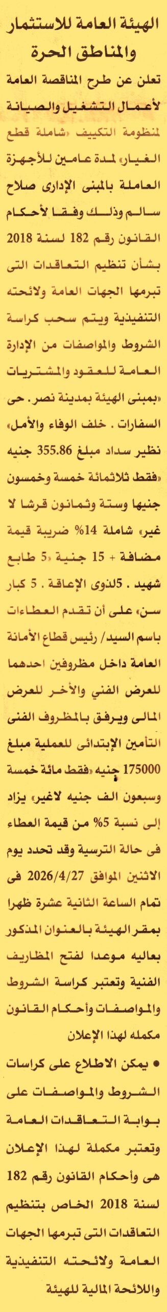 HOT Information مناقصة عامة لعملية تشغيل وصيانة منظومة التكييف “شاملة قطع الغيار” لمدة عامين للأجهزة العاملة بالمبنى الإداري صلاح سالم عن جريدة الأهرام Post navigation الهيئة العامة للنظافة والتجميل الإدارة العامة لري النوبارية