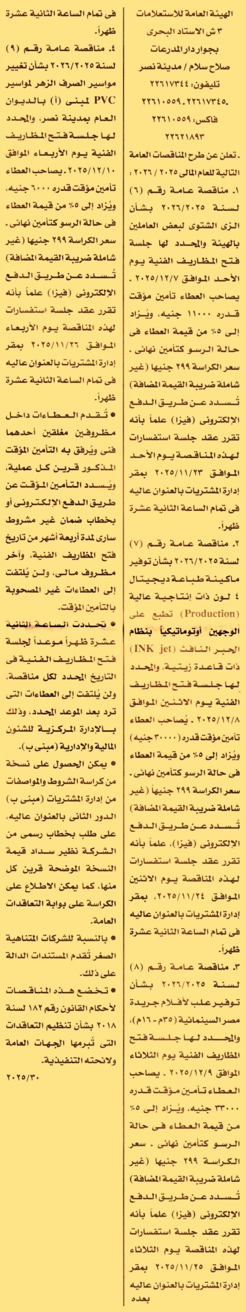 HOT Information مناقصة عامة رقم 5/2025/2026 لعملية توريد الزي الشتوي لبعض العاملين بالهيئة (جلسة الإستفسارات يوم 23/11/2025 ومدة سريان خطاب الضمان 4 أشهر) عن جريدة الأخبار Post navigation جامعة الزقازيق الأهلية الإدارة العامة للموارد المائية والري بالقليوبية