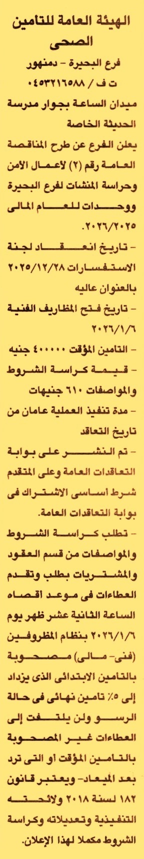 HOT Information مناقصة عامة رقم 2 لعملية تنفيذ أعمال الأمن وحراسة المنشأت لفرع البحيرة لمدة عامين (جلسة الاستفسارات يوم الاربعاء 28/12/2025) عن جريدة الجمهورية Post navigation وزارة الصحة والسكان شركة مصر للبترول