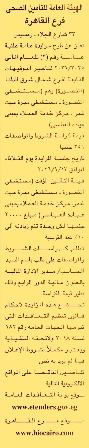 HOT Information مزايدة علنية عامة رقم 3/2025/2026 لعملية تأجير البوفيهات التابعة لفرع شمال شرق الدلتا “المنصورة” وهم “مستشفى المنصورة, مستشفى ميت غمر, مركز خدمة العملاء بمبنى عيادة العباسي” عن جريدة الجمهورية Post navigation مركز شباب الحبانية مركز شباب التوفيقية بدمياط