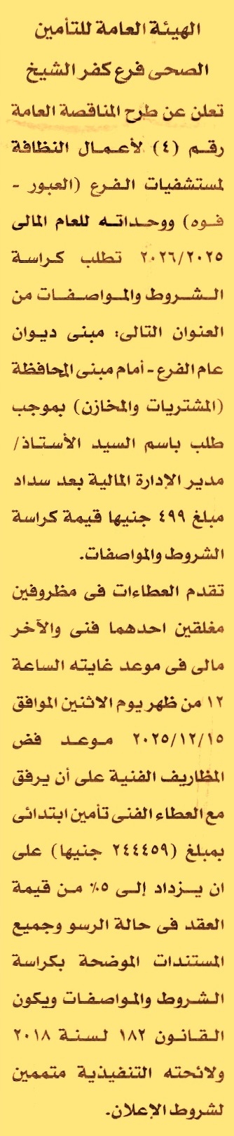 HOT Information مناقصة عامة رقم 4/2025/2026 لعملية تنفيذ أعمال النظافة لمستشفيات الفرع “العبور – فوه” ووحداته عن جريدة الأخبار Post navigation محافظة كفر الشيخ مجلس مدينة كفر الشيخ