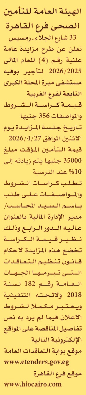 HOT information مزايدة علنية عامة رقم 4/2025/2026 لعملية تأجير بوفيه مستشفى مبرة المحلة الكبرى التابعة لفرع الغربية عن جريدة الأهرام Post navigation مركز التنمية الشبابية بدير مواس شركة مصر الوسطى لتوزيع الكهرباء