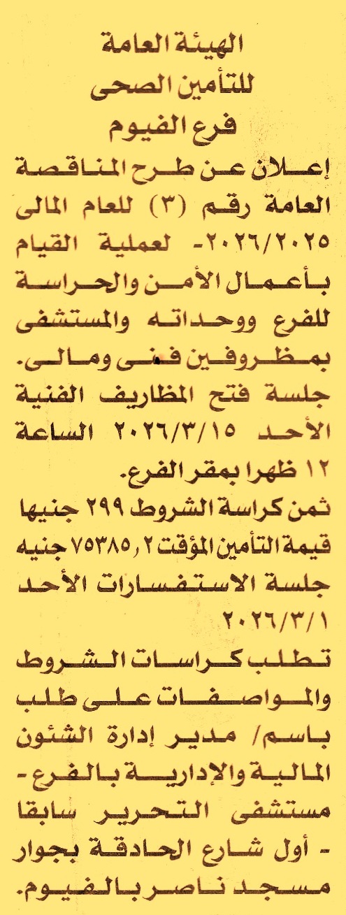 HOT information مناقصة عامة رقم 3/2025/2026 لعملية تنفيذ أعمال الأمن والحراسة للفرع ووحداته والمستشفى (جلسة الاستفسارات يوم 1/3/2026) عن جريدة الأخبار Post navigation رئاسة حي ثان طنطا مؤسسة أخبار اليوم