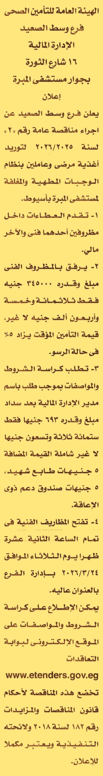 HOT Information مناقصة عامة رقم 2/2025/2026 لعملية توريد أغذية مرضى وعاملين بنظام الوجبات المطهية والمغلفة لمستشفى المبرة بأسيوط عن جريدة الأخبار Post navigation محافظة القليوبية الهيئة العامة لموانئ البحر الأحمر