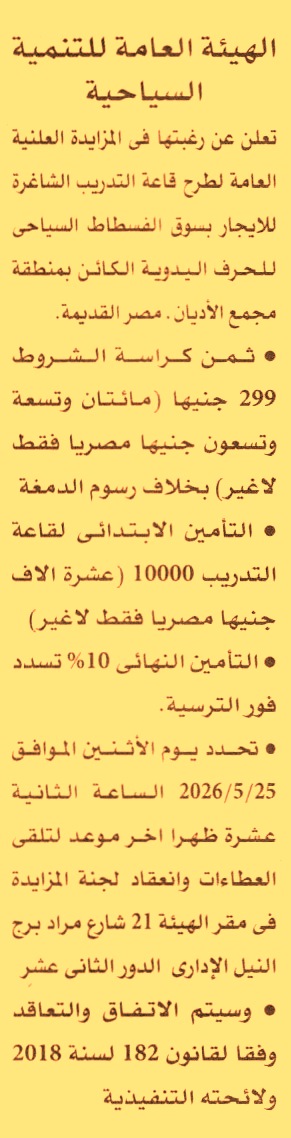 HOT information مزايدة علنية عامة لعملية تأجير قاعة التدريب الشاغرة بسوق الفسطاط السياحي للحرف اليدوية الكائن بمنطقة مجمع الأديان – مصر القديمة عن جريدة الأهرام Post navigation الهيئة القومية لسكك حديد مصر جامعة القاهرة