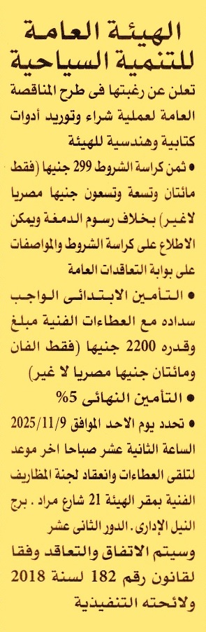 HOT information مناقصة عامة لعملية توريد أدوات كتابية وهندسية للهيئة عن جريدة الأهرام Post navigation الشركة المصرية للاتصالات الهيئة المصرية لسلامة الملاحة البحرية