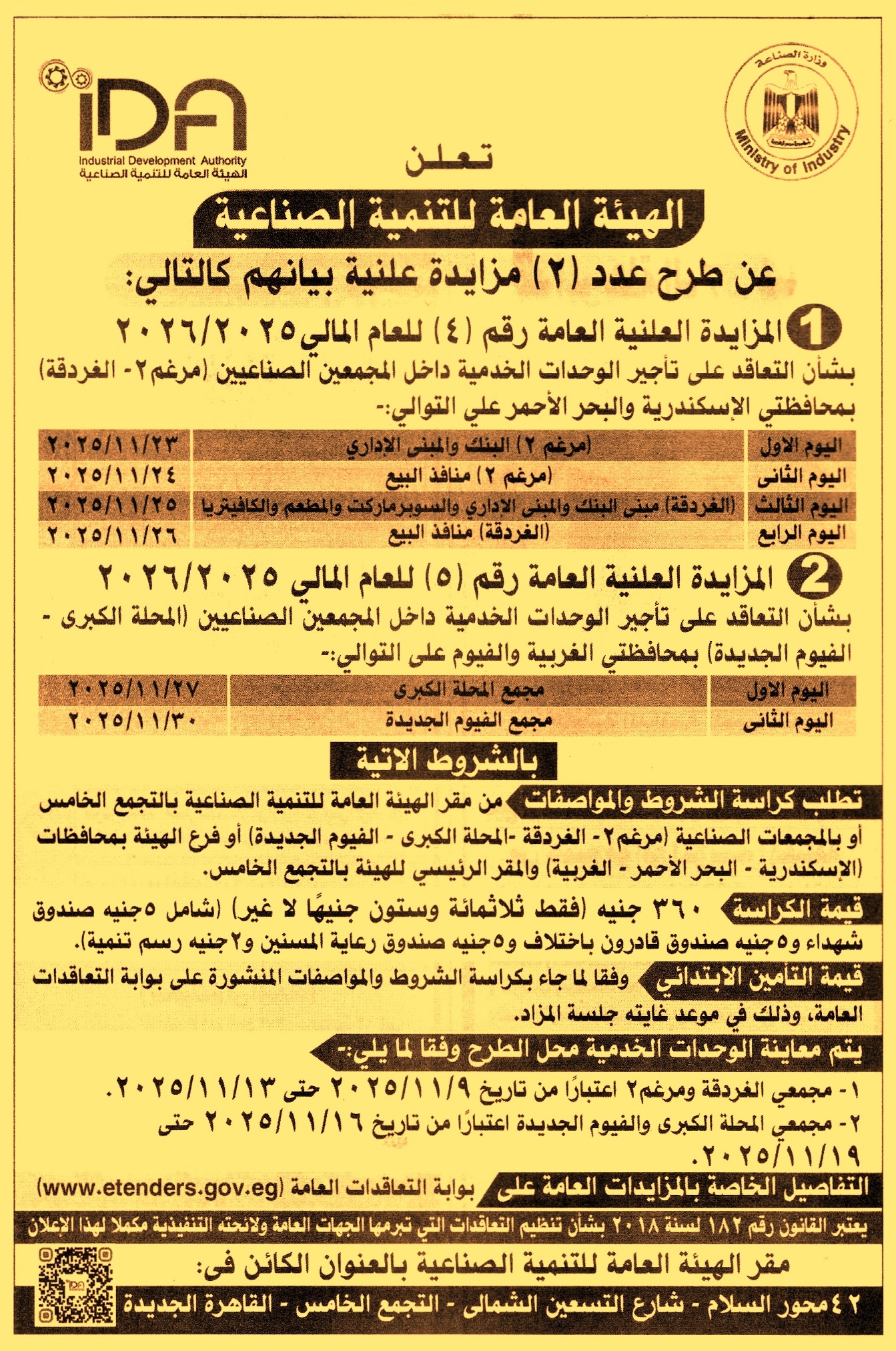 HOT Information مزايدة علنية عامة رقم 4/2025/2026 لعملية تأجير منافذ البيع بالمجمع الصناعي مرغم 2 (المعاينة من يوم 9/11/2025 حتى يوم 13/11/2025) عن جريدة الأهرام Post navigation الوكالة الألمانية للتعاون الدولي بنك التنمية الصناعية