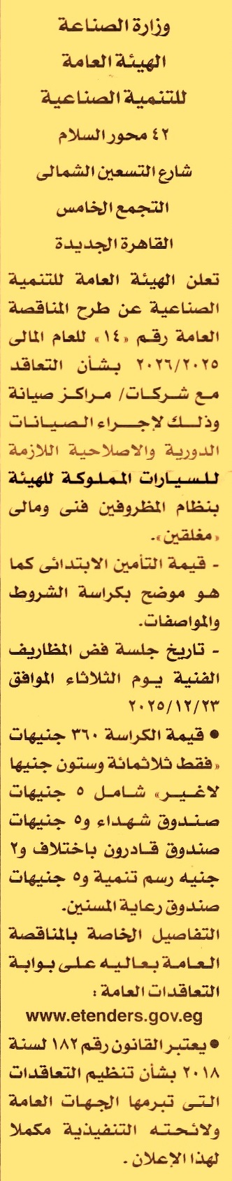 HOT Information مناقصة عامة رقم 14/2025/2026 لعملية تنفيذ أعمال الصيانات الدورية والإصلاحية اللازمة للسيارات المملوكة للهيئة عن جريدة الأخبار Post navigation الإدارة العامة لصرف شمال المنيا شركة مطاحن مصر الوسطى