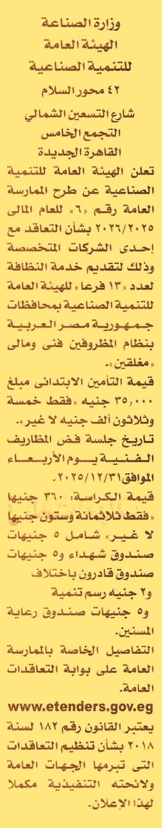 HOT Information ممارسة عامة رقم 6/2025/2026 لعملية تقديم خدمة النظافة لعدد 13 فرع للهيئة بالمحافظات عن جريدة الأخبار Post navigation رئاسة حي غرب المنصورة الإدارة العامة المتكاملة لري شرق الفيوم