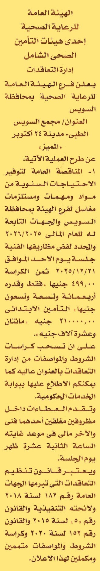 HOT Information مناقصة عامة لعملية توريد الاحتياجات السنوية من مواد ومهمات ومستلزمات مغاسل لفرع الهيئة بمحافظة السويس والجهات التابعة له للعام المالي 2025/2026 عن جريدة الأخبار Post navigation محافظة المنوفية الوحدة المحلية لمركز مغاغة