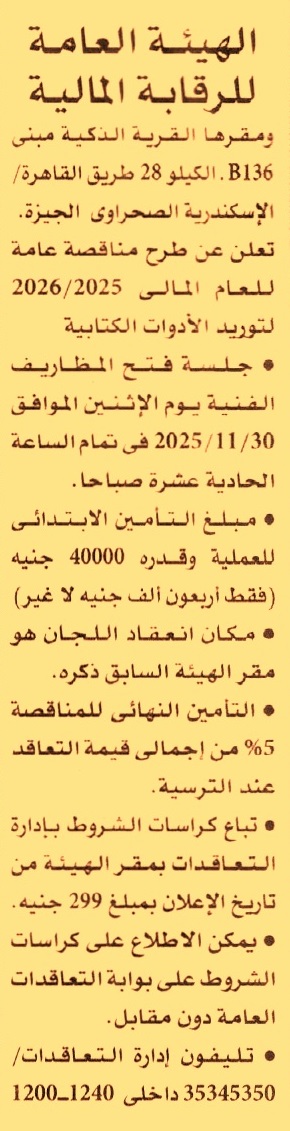 HOT Information مناقصة عامة لعملية توريد الأدوات الكتابية عن جريدة الأهرام Post navigation وزارة التربية والتعليم والتعليم الفني الجهاز المركزي للتنظيم والإدارة