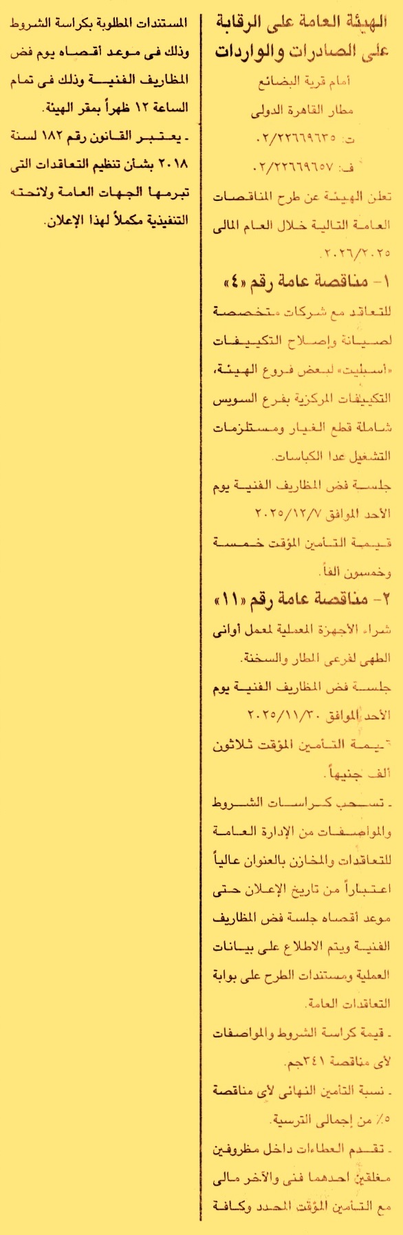 HOT Information مناقصة عامة رقم 4/2025/2026 لعملية صيانة وإصلاح التكييفات “اسبليت” لبعض فروع الهيئة والتكييفات المركزية بفرع السويس شاملة قطع الغيار ومستلزمات التشغيل عدا الكباسات عن جريدة الجمهورية Post navigation جامعة أسيوط الجديدة التكنولوجية نادي الرياضات البحرية بالغردقة