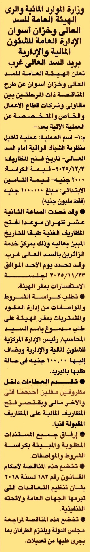 HOT Information مناقصة عامة لعملية تأهيل منظومة الشباك الواقية أمام السد العالي (جلسة الاستفسارات يوم 23/11/2025) عن جريدة الجمهورية Post navigation نادي وادي دجلة الرياضي نادي النصر الرياضي