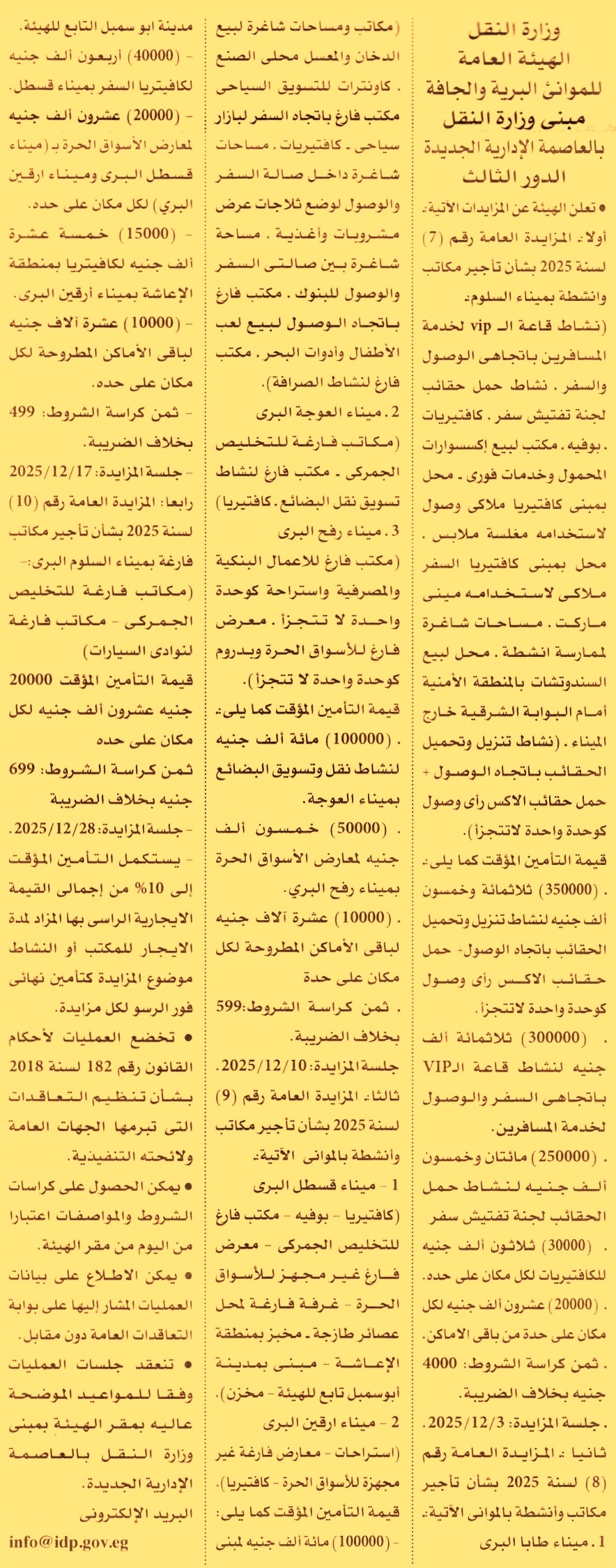 “نشاط قاعة الـVIP لخدمة المسافرين باتجاهي الوصول والسفر, نشاط حمل حقائب, لجنة تفتيش سفر, كافتيريا, بوفيه, مكتب لبيع إكسسوارات المحمول وخدمات فوري, محل بمبنى كافتيريا ملاكي وصول لاستخدامه مغسلة ملابس, محل بمبنى كافتيريا السفر ملاكي لاستخدامه ميني ماركت, مساحات شاغرة لممارسة أنشطة, محل لبيع السندوتشات بالمنطقة الأمنية أمام البوابة الشرقية خارج الميناء, نشاط تنزيل وتحميل الحقائب باتجاه الوصول وحمل حقائب الاكس راي وصول كوحدة واحدة لا تتجزء”