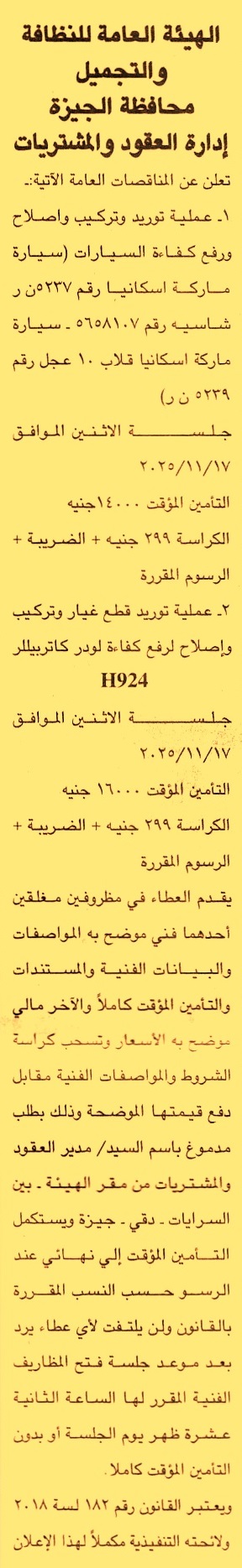 HOT Information مناقصة عامة لعملية توريد وتركيب وإصلاح ورفع كفاءة السيارات “سيارة ماركة اسكانيا رقم 5237 ن ر شاسيه رقم 5658107 – سيارة ماركة اسكانيا قلاب 10 عجل رقم 5239 ن ر” عن جريدة الجمهورية Post navigation الجهاز المركزي للتعبئة العامة والإحصاء الغرفة التجارية المصرية بدمياط