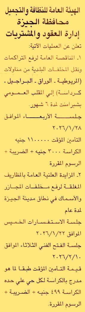 HOT Information مناقصة عامة لعملية رفع التراكمات ونقل المخلفات البلدية من مناولات “المريوطية, الوراق, البراجيل, كرداسة” إلى المقلب العمومي بشبرامنت لمدة 6 شهور عن جريدة الجمهورية Post navigation مركز البحوث الزراعية المركز القومي لبحوث الإسكان