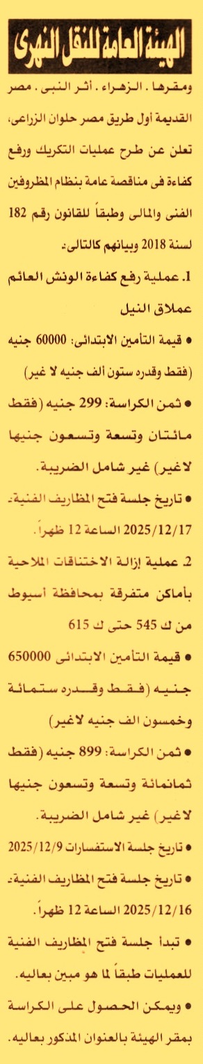 HOT Information مناقصة عامة لعملية رفع كفاءة الونش العائم عملاق النيل عن جريدة الأهرام Post navigation نادي المنيا الرياضي الوحدة المحلية لمركز ومدينة كفر الدوار