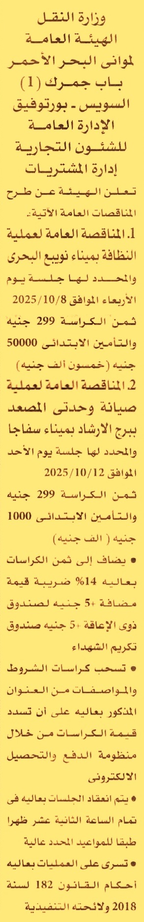 HOT information مناقصة عامة لعملية تنفيذ أعمال النظافة بميناء نويبع البحري عن جريدة الأهرام Post navigation الوحدة المحلية لمركز ومدينة فايد المؤسسة القومية لتنمية الأسرة والمجتمع