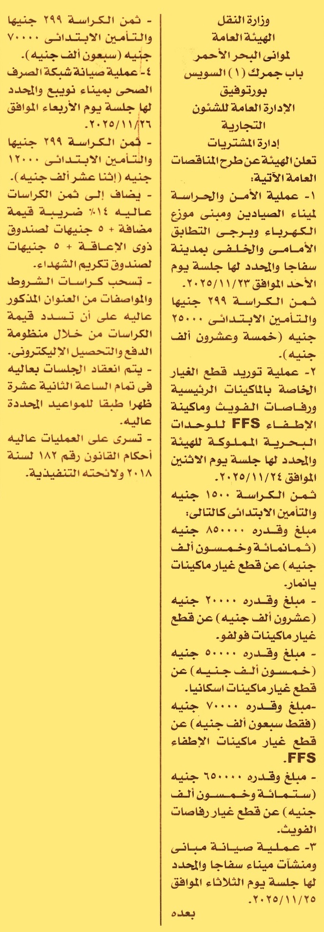 HOT Information مناقصة عامة لعملية تنفيذ أعمال الأمن والحراسة لميناء الصيادين ومبنى موزع الكهرباء وبجي التطابق الأمامي والخلفي بمدينة سفاجا عن جريدة الأخبار Post navigation مستشفيات جامعة المنصورة محافظة أسيوط