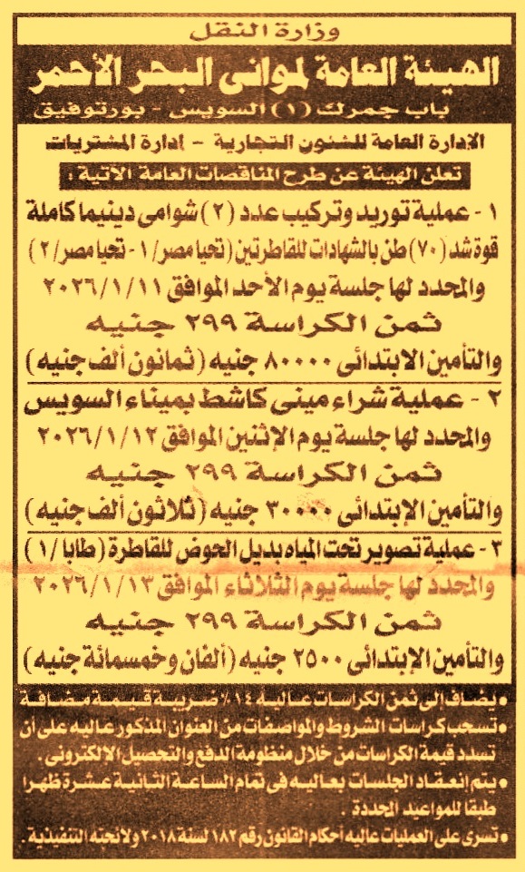 HOT Information مناقصة عامة لعملية توريد وتركيب عدد 2 شوامي دينيما كاملة قوة شد 70 طن بالشهادات للقاطرتين “تحيا مصر 1, تحيا مصر 2” عن جريدة الجمهورية Post navigation مدينة مصيف بلطيم الهيئة العامة لميناء الإسكندرية