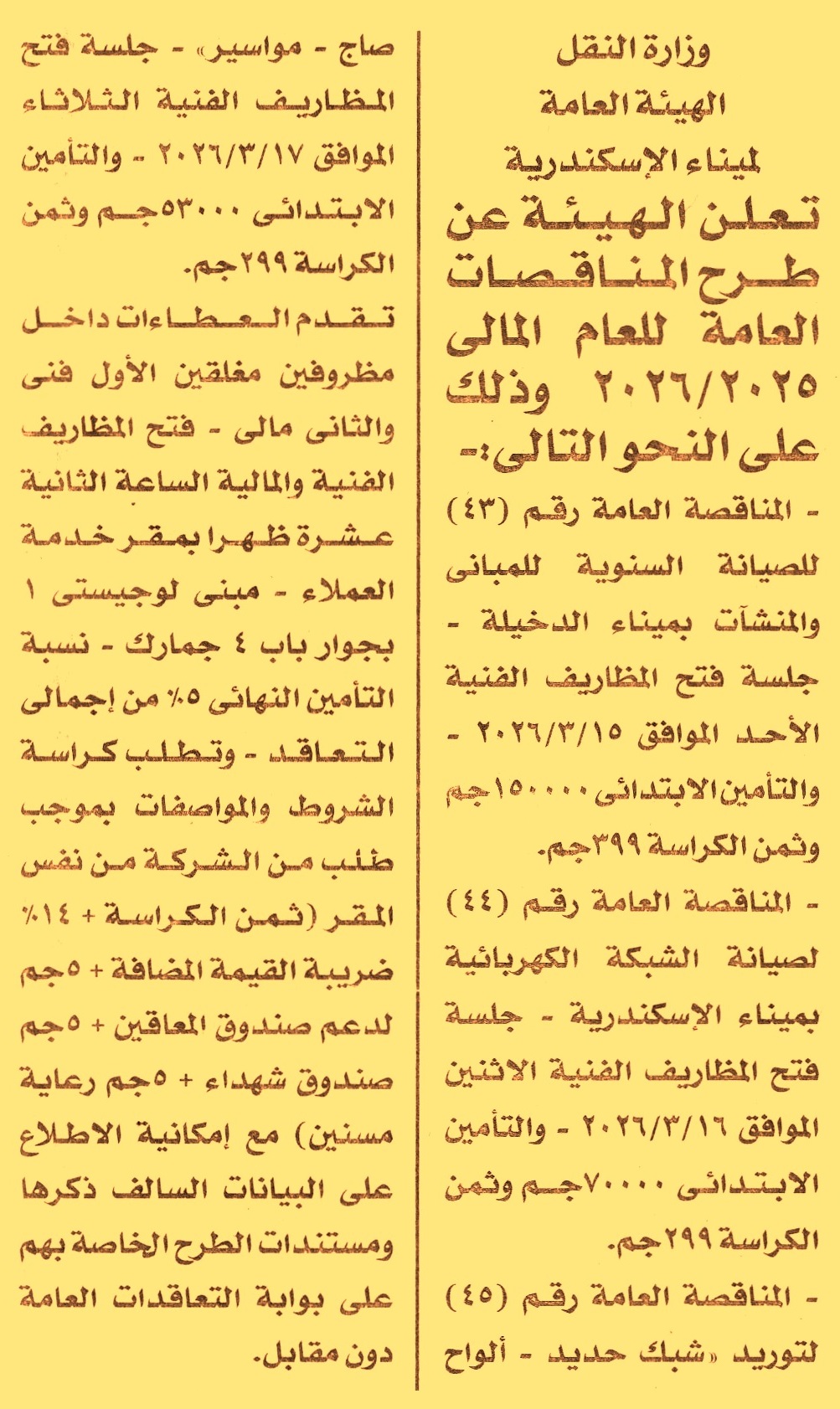 HOT Information مناقصة عامة رقم 43/2025/2026 لعملية تنفيذ أعمال الصيانة السنوية للمباني والمنشأت بميناء الدخيلة (جلسة الاستفسارات يوم 8/2/2026) عن جريدة الأخبار Post navigation جهاز تنمية مدينة المنيا الجديدة شركة الخدمات الطبية