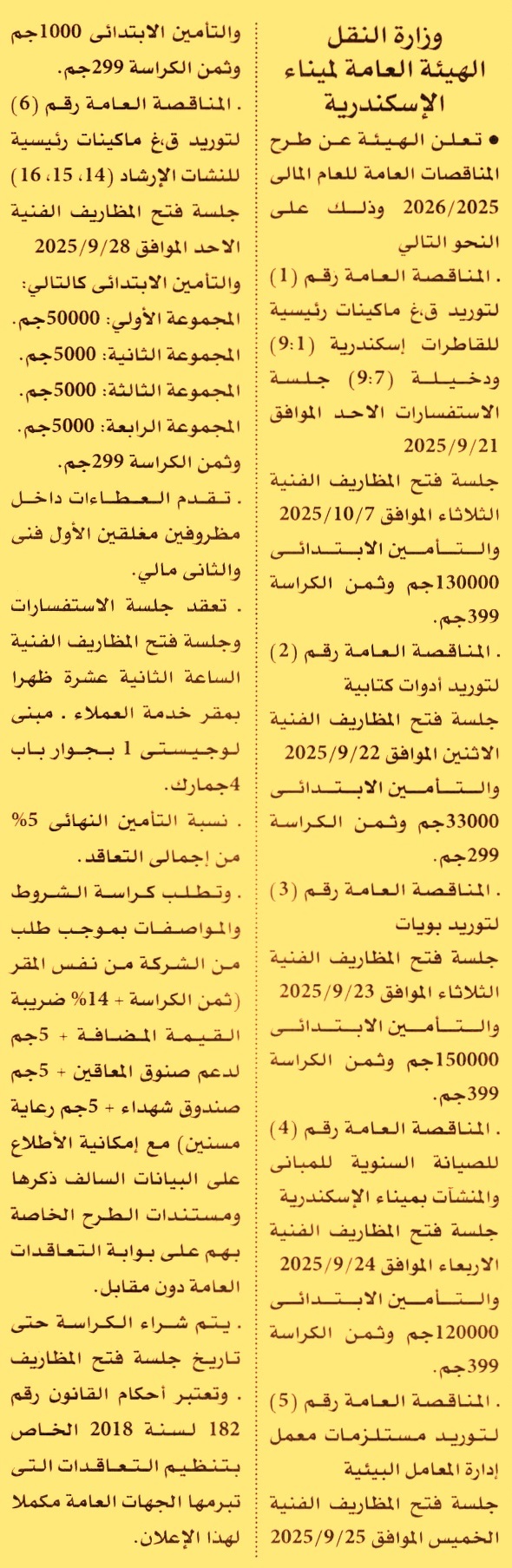 HOT information مناقصة عامة رقم 1/2025/2026 لعملية توريد قطع غيار ماكينات رئيسية للقاطرات إسكندرية “1 : 9” ودخيلة “7 : 9” (جلسة الاستفسارات يوم 21/9/2025) عن جريدة الأهرام Post navigation رئاسة مركز ومدينة المحلة الكبرى محافظة الإسكندرية