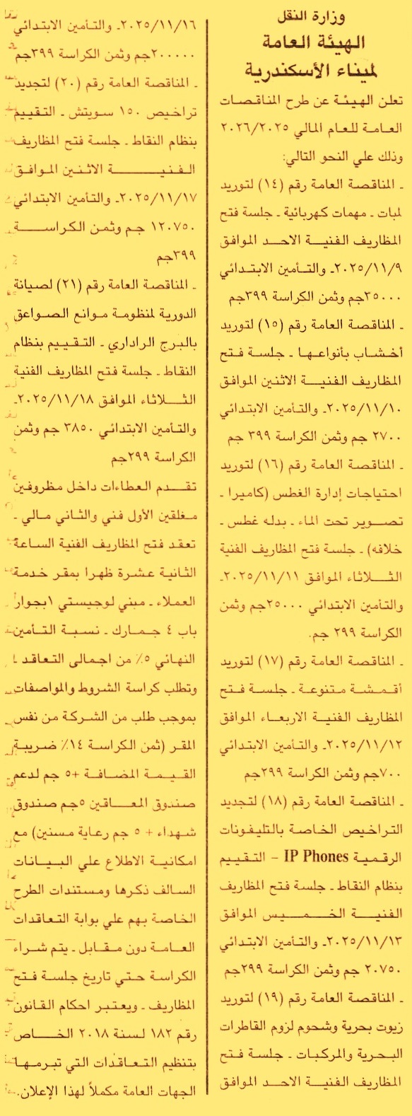 HOT Information مناقصة عامة رقم 14/2025/2026 لعملية توريد لمبات ومهمات كهربائية عن جريدة الجمهورية Post navigation حي المنتزه أول شركة مياه الشرب والصرف الصحي بشمال وجنوب سيناء