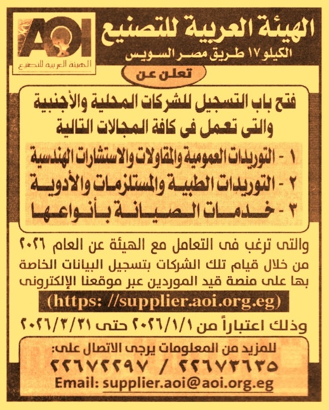 فتح باب القيد بسجل الموردين للشركات المحلية والأجنبية في المجالات الأتية