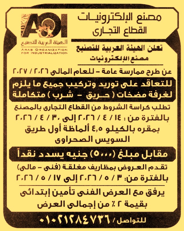 HOT information ممارسة عامة لعملية توريد وتركيب جميع ما يلزم لغرفة مضخات “حريق, شرب” متكاملة (تباع الكراسة في الفترة من 14/4/2026 إلى 30/4/2026 وتقدم العطاءات في الفترة من 3/5/2026 إلى 17/5/2026) عن جريدة الأهرام Post navigation البنك الأهلي المصري البنك الأهلي المصري