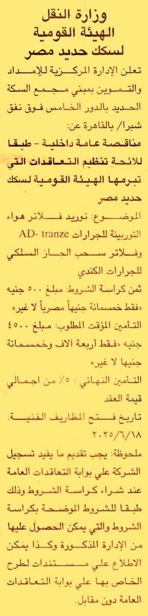 HOT Information مناقصة عامة داخلية لعملية توريد فلاتر هواء التوربينة للجرارات AD-tranze وفلاتر سحب الجاز السلكي للجرارات الكندي عن جريدة الجمهورية Post navigation شركة مصر للسياحة مركز شباب الخفيج