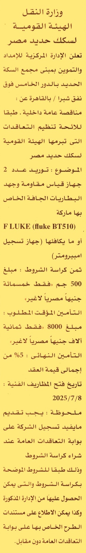 HOT Information مناقصة عامة داخلية لعملية توريد عدد 2 جهاز قياس مقاومة وجهد البطاريات الجافة الخاص بها ماركة F LUKE “fluke BT510” أو ما يكافئها “جهاز تسجيل امبيرومتر” عن جريدة الأهرام Post navigation جامعة القاهرة شركة الغازات البترولية