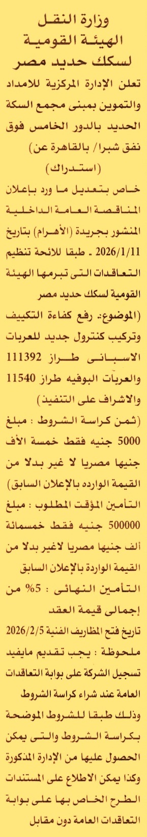 تعلن الهيئة عن تعديل بخصوص المناقصة العامة الداخلية لعملية