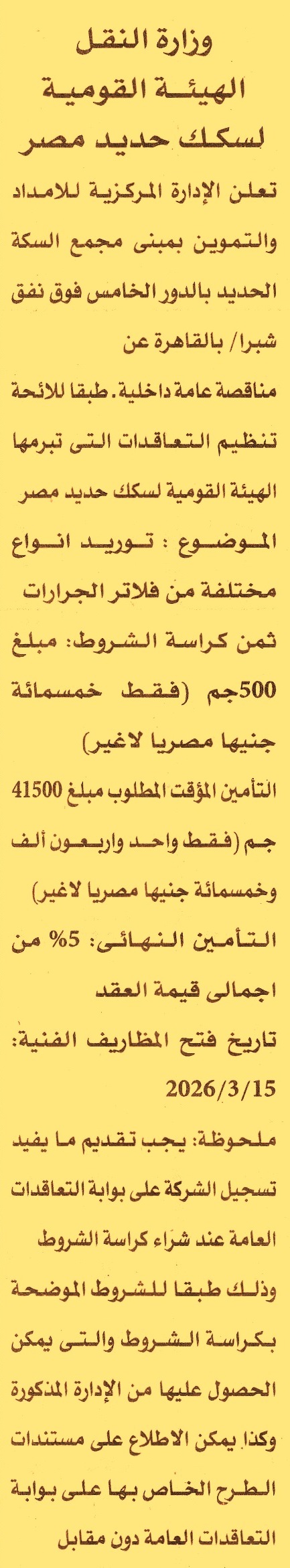 HOT information مناقصة عامة داخلية لعملية توريد أنواع مختلفة من فلاتر الجرارات عن جريدة الأهرام Post navigation شركة الفيوم لصناعة السكر الجمعية التعاونية للبناء والإسكان لأعضاء نادي هليوبوليس الرياضي