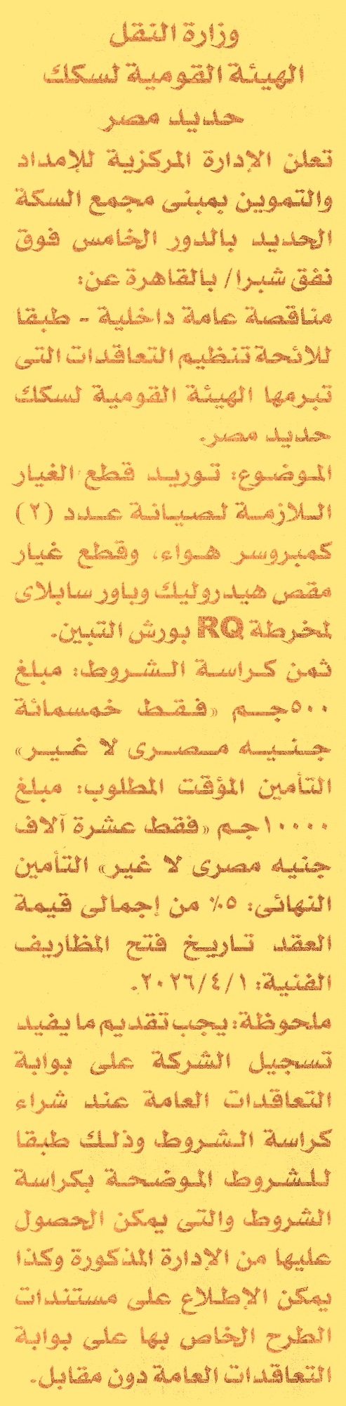HOT information مناقصة عامة داخلية لعملية توريد قطع الغيار اللازمة لصيانة عد 2 كمبروسر هواء وقطع غيار مقص هيدروليك وباور سابلاي لمخرطة RQ بورش التبين عن جريدة الأخبار Post navigation الإدارة العامة للموارد المائية والري بشرق الدقهلية مكتبة الإسكندرية