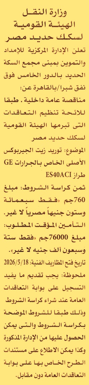 HOT Information مناقصة عامة داخلية لعملية توريد زيت الجيربوكس الأصلي الخاص بالجرارات GE طراز ES40ACI عن جريدة الأهرام Post navigation مؤسسة مستشفى أورام الأطفال 57357 وزارة الصحة والسكان