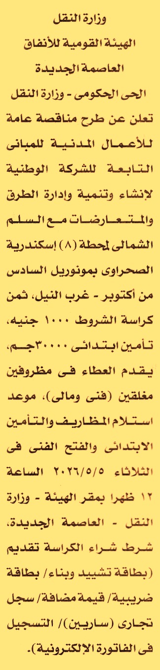 HOT Information مناقصة داخلية عامة لعملية تنفيذ الأعمال المدنية للمباني التابعة للشركة الوطنية لإنشاء وتنمية وإدارة الطرق والمتعارضات مع السلم الشمالي لمحطة 8 إسكندرية الصحراوي بمونوريل السادس من أكتوبر عن جريدة الأخبار Post navigation مدينة البعوث الإسلامية محافظة أسيوط
