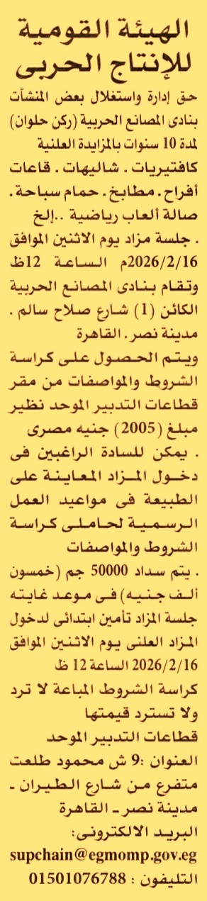 HOT Information مزايدة علنية لعملية حق إدارة واستغلال بعض المنشأت بنادي المصانع الحربية “ركن حلوان” “كافتيريات, شاليهات, قاعات أفراح, مطابخ, حمام سباحة, صالة ألعاب رياضية .. إلخ” لمدة 10 سنوات عن جريدة الأهرام Post navigation الهيئة العامة للتنمية السياحية البنك الزراعي المصري